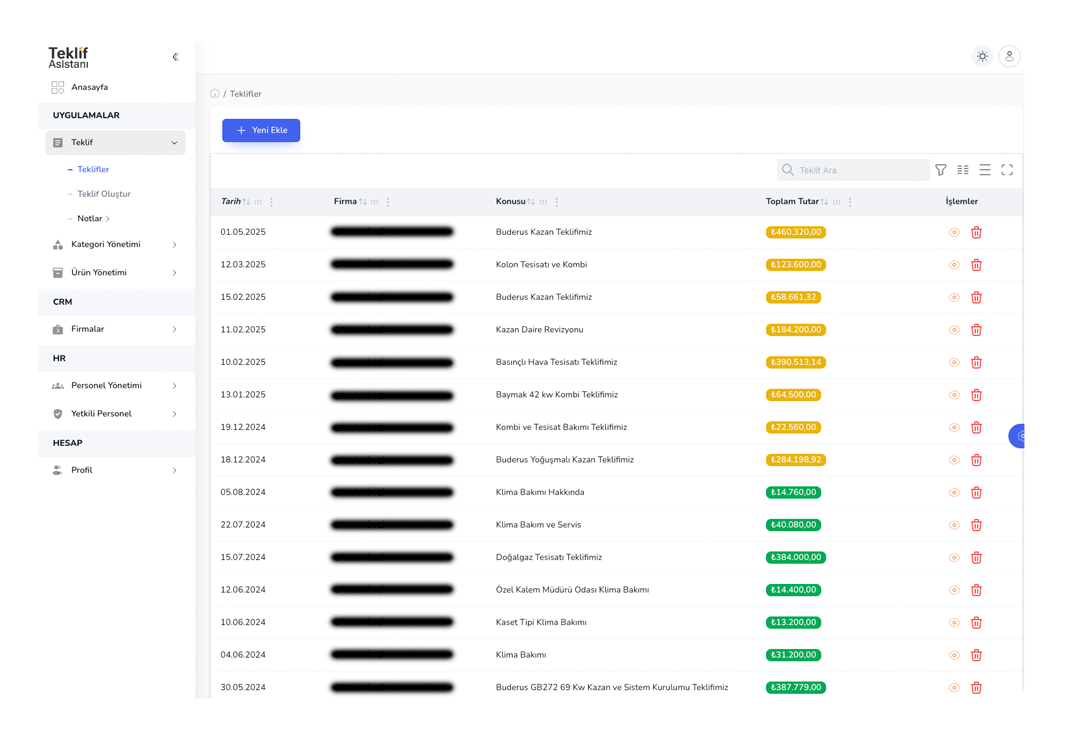 Müşteri bilgileri, ürün kalemleri, teklif versiyonları… Hepsi kontrol altında.